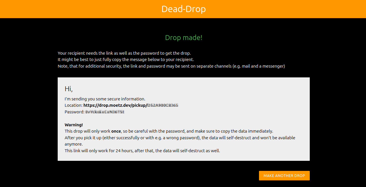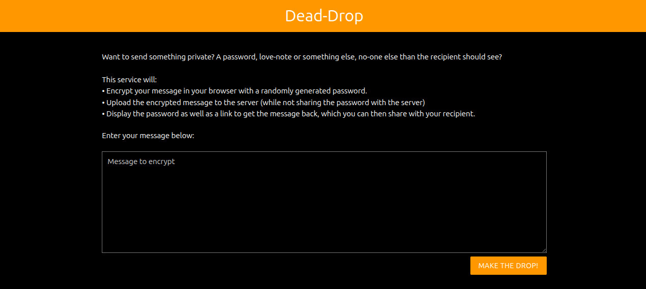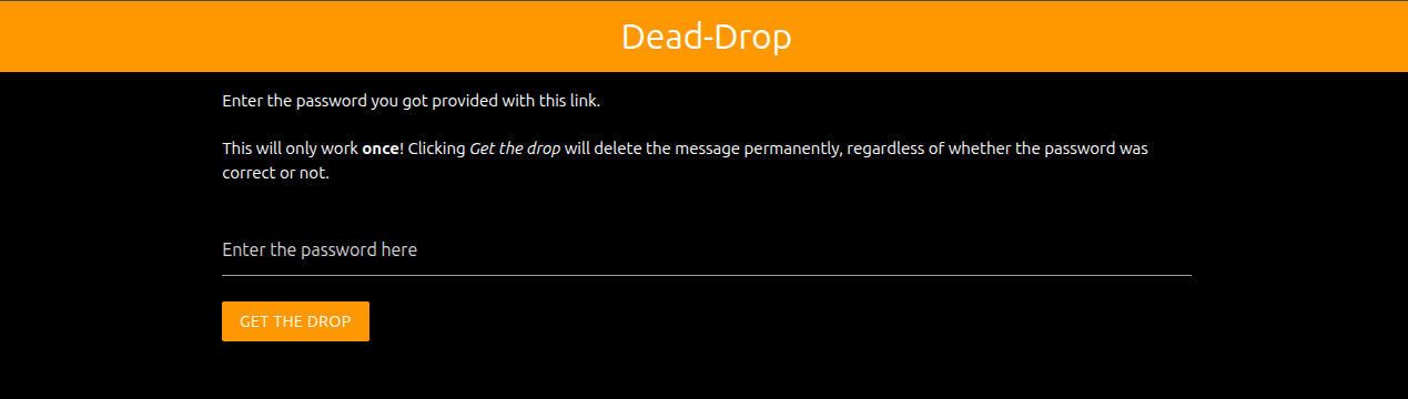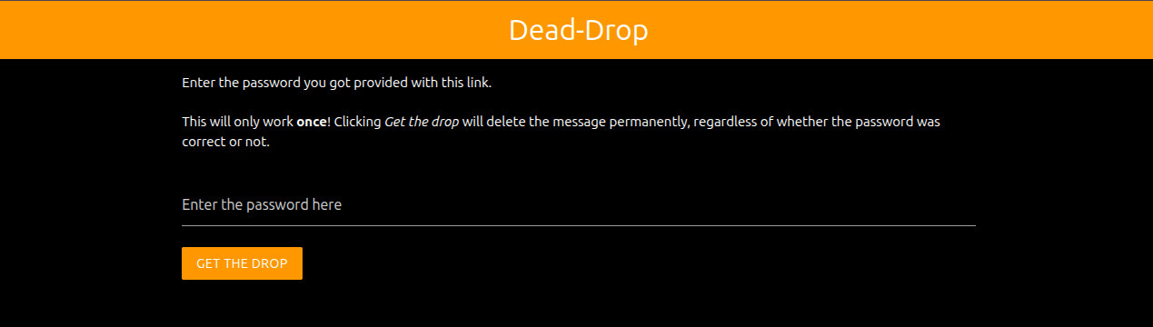 Basically, this service generates a random password in the browser, encrypts the message with sjcl in the browser itself, and then sends only the encrypted cipher to the server (which stores it for a maximum of 24 hours). So the server will never see the password that is required to encrypt the data. After that, the browser will show the link to pick up the drop as well as the generated password to the user. This text is then to be sent to the recipient of the message by any channel (e.g. email, chat or some other way of communication). The recipient will open the pickup-link, and will be prompted for the password. As soon as the password is entered, the encrypted cipher is fetched from the server (which will delete the data as soon as it's loaded once), and the browser will try to decrypt the ciphertext using the provided password. If that succeeds, the decrypted message will be presented. Otherwise, an error will be shown, and the message will be gone forever, as the encrypted ciphertext has already been cleaned from the server. Therefore, this dead-drop will truly only try to deliver the message once, and after that it's gone forever. Furthermore, if the link or ciphertext would have been intercepted by an attacker, the recipient would know as the drop is no longer available, signalling you to best not treat the sent information (e.g. password) as not secret anymore.
