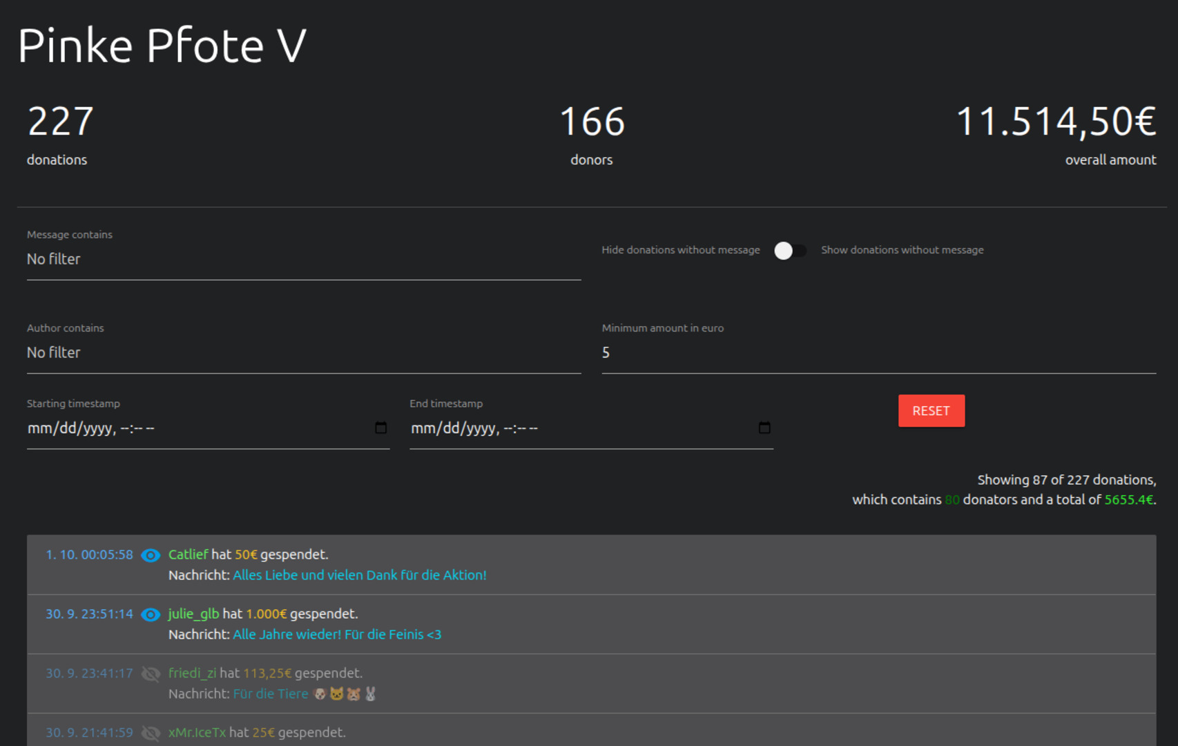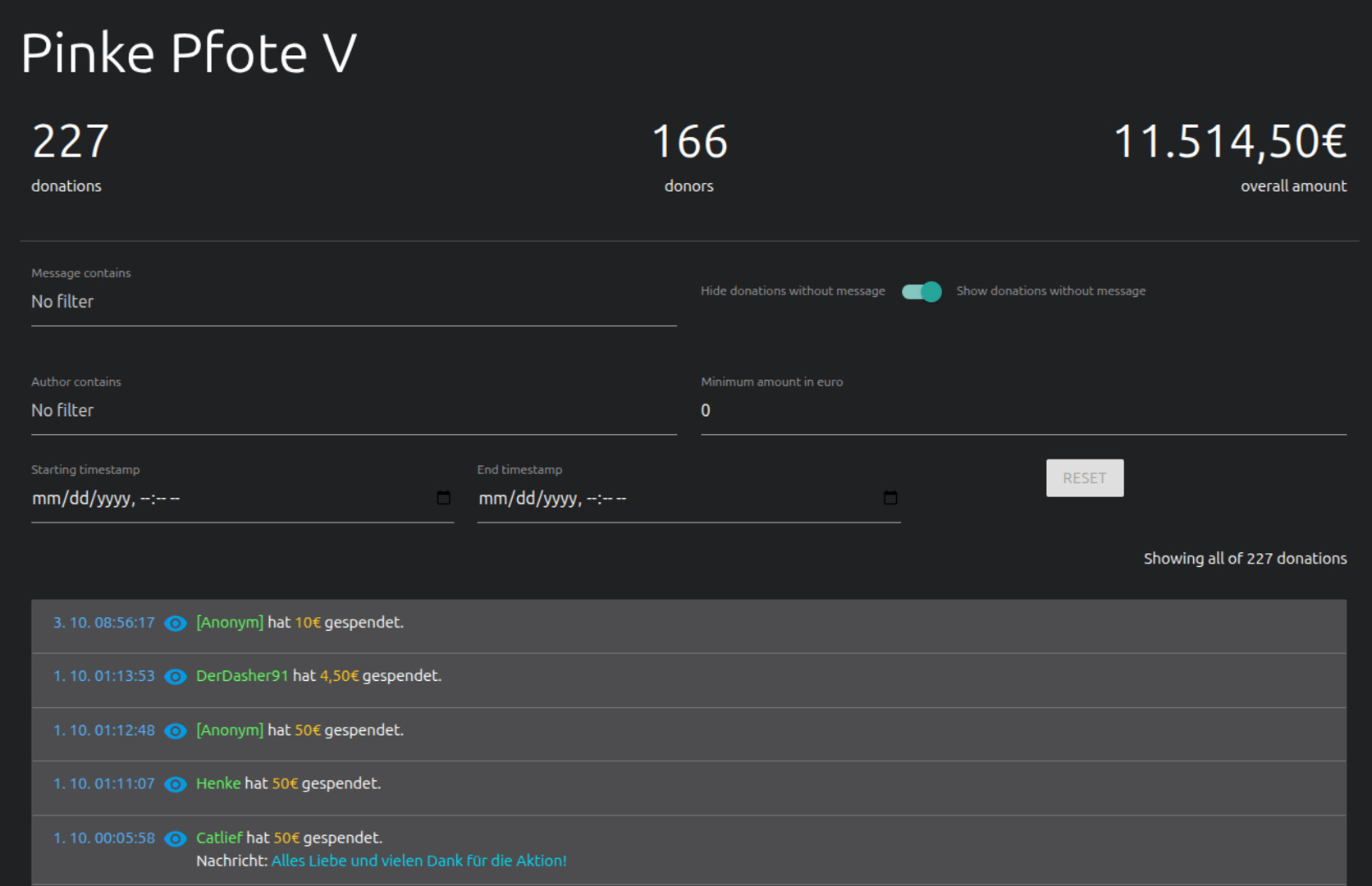 As one of the tools, the DonationTracker has been developed, which enables a self-reloading view of donations sent to a specific Betterplace event. So, streamers can easily see the latest donations without the need to refresh pages, and can mark donations already seen / said, to not duplicate things.